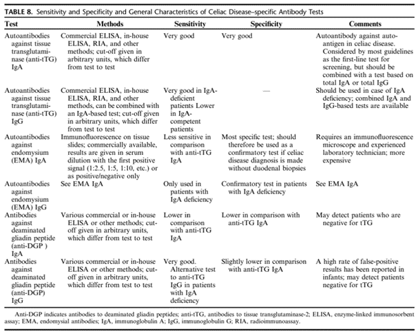 - Silvester, J. A., Kurada, S., Szwajcer, A., Kelly, C. P., Leffler, D. A., & Duerksen, D. R. (2017). Tests for Serum Transglutaminase and Endomysial Antibodies Do Not Detect Most Patients With Celiac Disease and Persistent Villous Atrophy on Gluten-free Diets: a Meta-analysis. Gastroenterology, 153(3), 689-701.e681. https://doi.org/10.1053/j.gastro.2017.05.015
