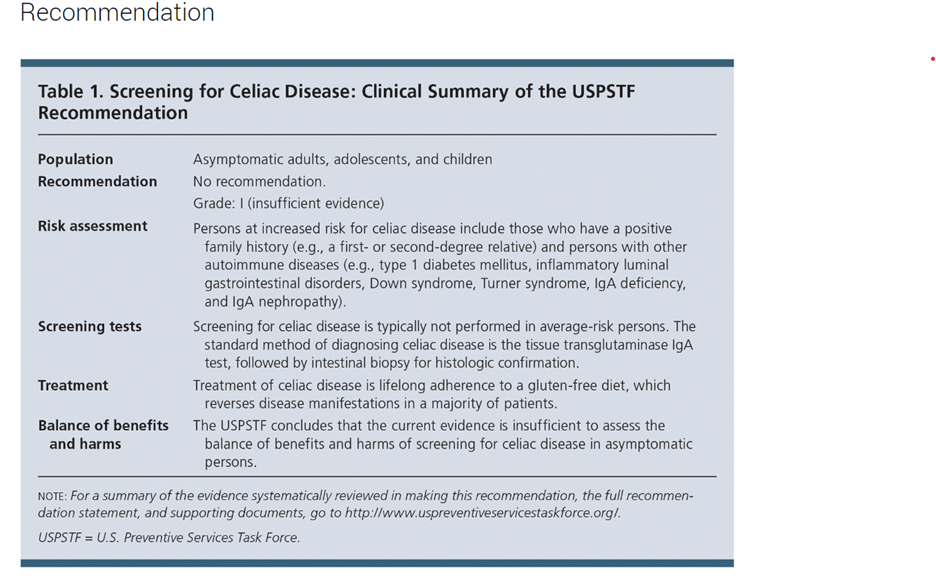 - For asymptomatic individuals not at an increased risk for developing celiac disease (see Note 1), testing for celiac disease is considered NOT MEDICALLY NECESSARY.